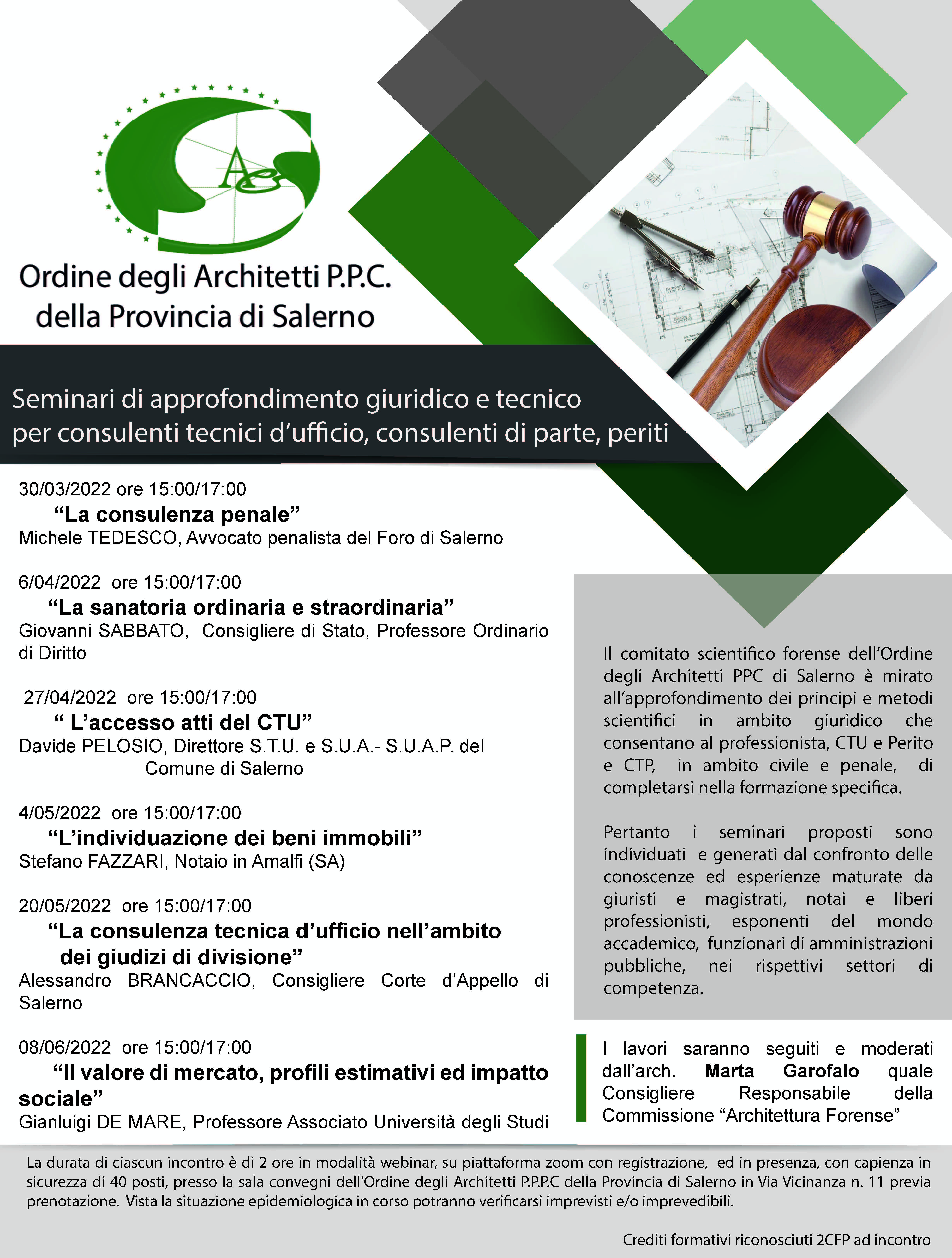 La Commissione “Architettura Forense” dell’Ordine degli Architetti PPC di Salerno cura, fra l’altro, l’aggiornamento e l’approfondimento dei principi e metodi scientifici in ambito giuridico per consentire al professionista, CTU - Perito e CTP, in ambito civile e penale, di completarsi nella formazione specifica. Pertanto i seminari proposti sono individuati e generati dal confronto delle conoscenze ed esperienze maturate nel settore da giuristi e magistrati, notai e liberi professionisti, esponenti del mondo accademico e dirigenti di Pubbliche Amministrazioni, nei rispettivi settori di competenza.